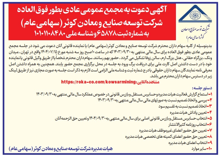 آگهی دعوت به مجمع عمومی عادی بطور فوق العاده شرکت توسعه صنایع و معادن کوثر(سهامی عام)