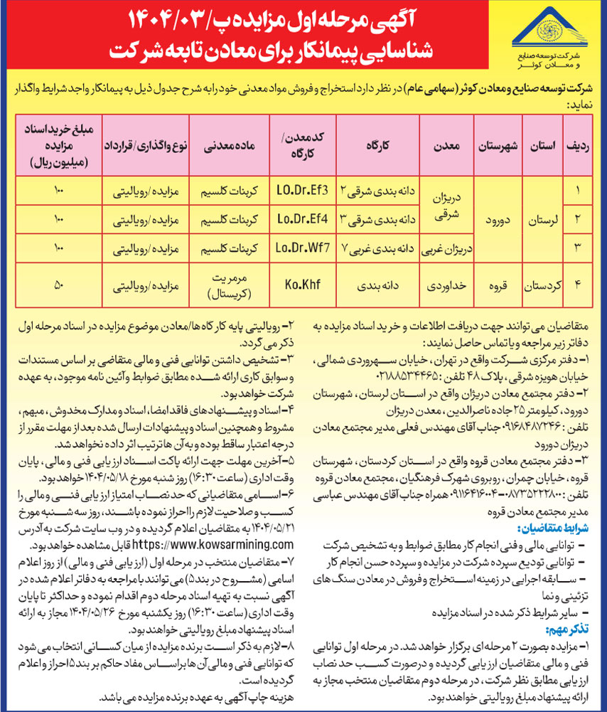 صفحه نخست | مزایده ها و مناقصات | آگهی مرحله اول مزایده پ/۱۴۰۴/۰۳ شناسایی پیمانکار برای معادن تابعه شرکت